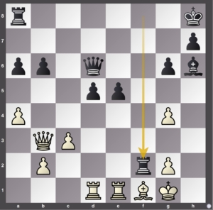 Het torenoffer, 1… Txf2. Als wit het aanneemt 2. Kxf2 Dc5+ 3. Td4 (anders loopt het mat) exd4 4. Db4 Le3+ met voordeel voor zwart. Wit speelde echter de beste zet 2. Dxd5 Dxd5 3. Txd5 Txb2 en zwart had toch mooi een plus.